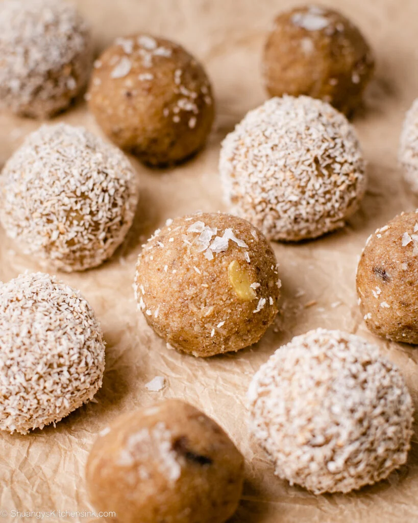 The image shows salted caramel energy bites laid out on parchment paper- some have additional shredded coconut on them